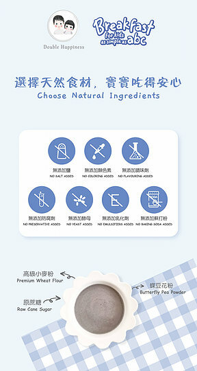優質小麥粉,脫水蝶豆花粉,棕糖(天然防腐劑)。